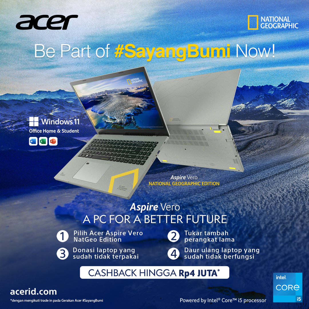 Laptop Acer Aspire Vero National Geographic Edition tersedia mulai dari 15 Februari 2022 dengan harga Rp10.999.000, termasuk pre-installed Windows 11 Home terbaru dan Microsoft Office Home & Student 2021.