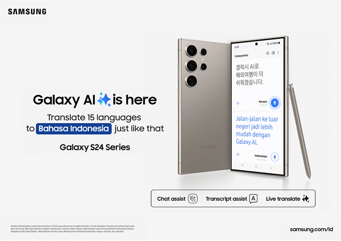 “Hari ini, Bahasa Indonesia sudah tersedia di paket pilihan bahasa Galaxy AI di Galaxy S24 series. Pengguna Galaxy S24 Series bisa menerjemahkan berbagai bahasa asing ke Bahasa Indonesia, atau sebaliknya, saat menggunakan fitur-fitur seperti Interpreter, Chat Assist, Transcript Assist, Live Translate, dan Note Assist. ” ujar Harry Lee, President of Samsung Electronics Indonesia.