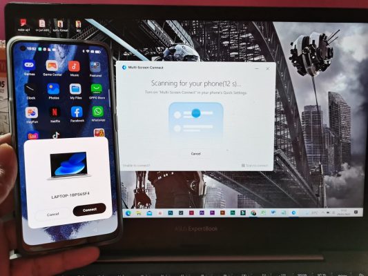 Aktifkan juga WiFi dan Bluetooth di laptop dan di Reno7 5G, lalu hubungkan dengan jaringan internet yang sama.- Buka aplikasi PC Connect di laptop. Jika perangkat Reno7 5G Anda berada di dekat laptop, maka otomatis muncul pop-up di layar laptop, kemudian pilih ‘Connect’ untuk menghubungkan laptop ke perangkat.