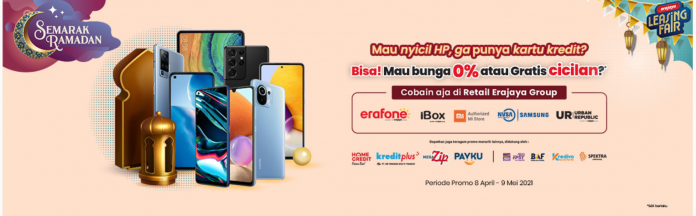 Bekerjasama dengan berbagai financing partner Erajaya Group seperti HCI, Kredit Plus, Megazip, Payku, Aeon, BAF, Samsung F+ dan Kredivo, pelanggan dapat menikmati cicilan dengan bunga 0% hingga gratis 2 (dua) kali cicilan. Penawaran ini berlaku dari tanggal 8 April hingga 9 Mei 2021 dengan melakukan transaksi di toko offline Erafone, iBox, Samsung by NASA, Mi Store, dan Urban Republic.
