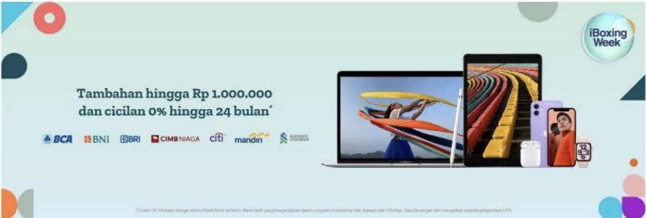 - Tambahan diskon hingga Rp 1.000.000* dan cicilan 0% sampai dengan 24 bulan* dengan menggunakan kartu kredit BCA, BNI, BRI, CIMB, Citibank, Mandiri, dan Standart Chartered