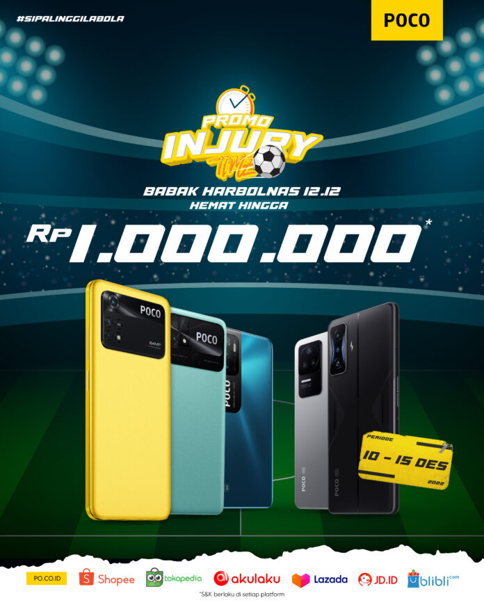 Melanjutkan euforia kemeriahan pesta sepak bola terbesar dunia yang memasuki babak-babak penentuan, POCO hadirkan #PromoInjuryTime babak Harbolnas 12.12. Kelanjutan penawaran khusus dari POCO ini semakin mendobrak dengan potongan harga yang semakin besar yang bisa didapatkan di PO.CO.ID dan mitra ecommerce resmi POCO di Indonesia, termasuk Akulaku, Blibli, JD.ID, Shopee, dan Tokopedia.