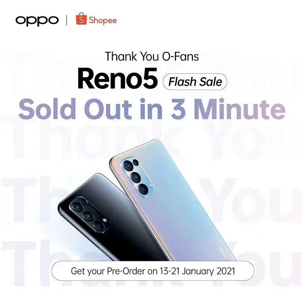 “Terima kasih atas sambutan luar biasa konsumen Indonesia kepada hape OPPO Reno 5. Perangkat ini habis terjual 400 unit dalam sesi penjualan kilat di situs e-dagang shoppe hanya dalam waktu 3 menit. Sejatinya penjualan kilat ini berlangsung dari pukul 21.00 hingga pukul 23.59 WIB, namun dalam waktu 3 menit perangkat langsung habis terjual. Namun tidak perlu khawatir, mulai hari ini konsumen dapat melakukan pemesanan pada situs yang sama hingga 21 Januari mendatang.” Ujar Aryo Meidianto A, PR Manager OPPO Indonesia.