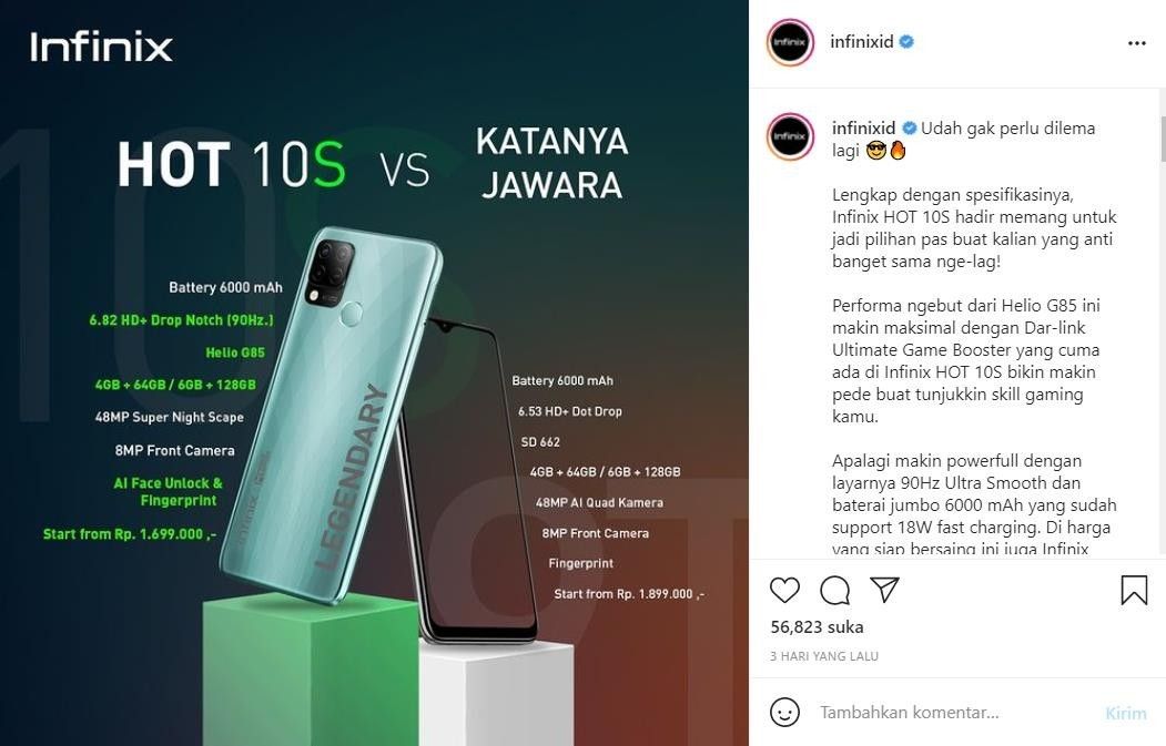 Yup, berawal dugaan kekeliruan konten komparasi pada akun IG resmi Infinix (@infinixid), yang memposting perbandingan hp terbarunya, seri Hot 10S dengan smartphone yang diberi julukan “Katanya Jawara”. Akhirnya Infinix terlibat peseteruan dengan Xiaomi