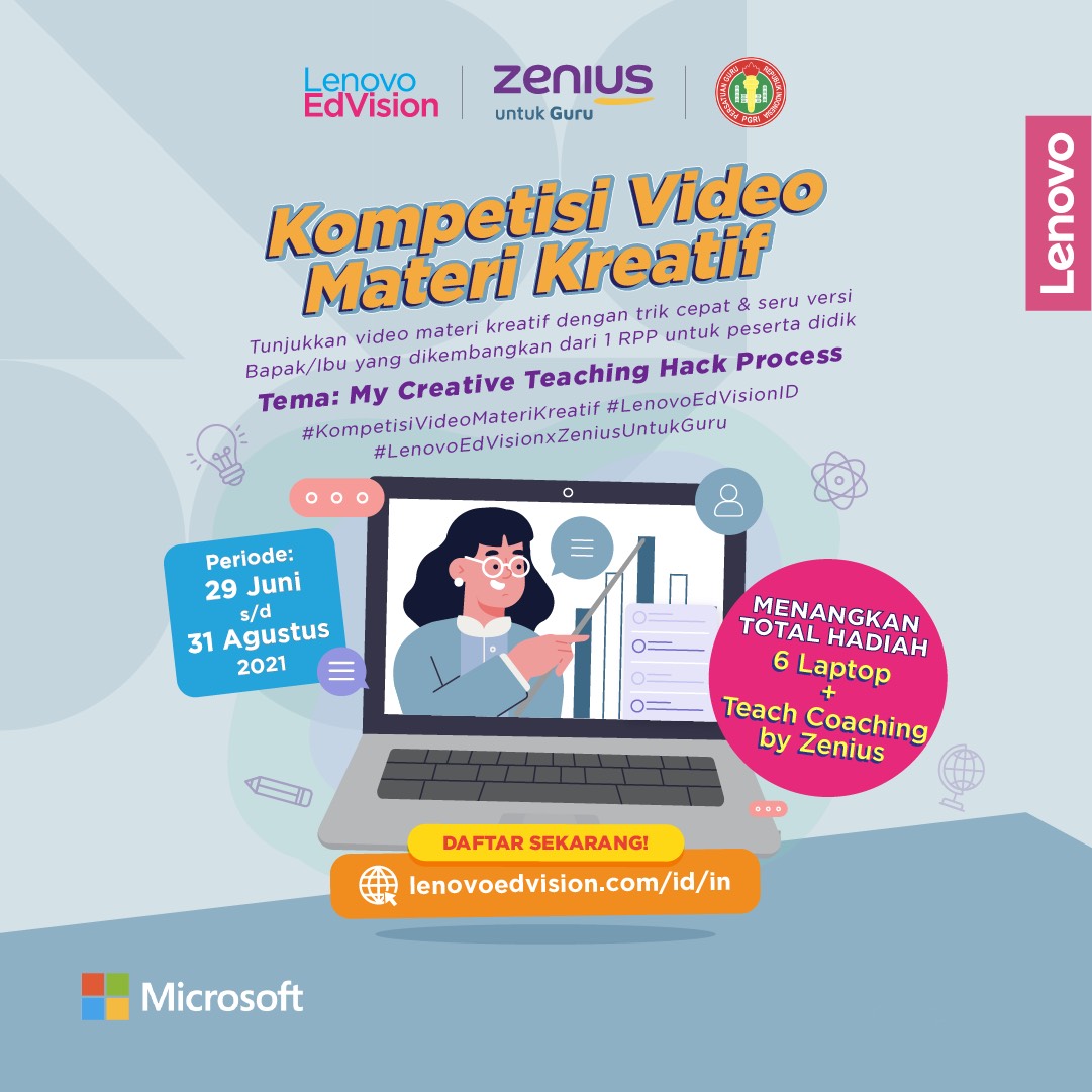 Untuk memotivasi dan menambah semangat para guru dalam menghadirkan inovasi mengajar yang optimal, salah satu raksasa perusahaan teknologi di dunia, Lenovo, menggandeng platform pendidikan, Zenius untuk Guru, untuk menggelar “Kompetisi Video Materi Kreatif”. Kompetisi ini dibuat untuk memberikan kesempatan kepada para guru untuk saling menunjukkan, berbagi, dan menginspirasi cara-cara kreatif yang dihadirkan dalam kegiatan PJJ. Kompetisi ini terbuka untuk semua guru di jenjang sekolah, mulai dari guru Sekolah Dasar (SD), Sekolah Menengah Pertama (SMP), dan Sekolah Menengah Atas (SMA) di seluruh Indonesia.