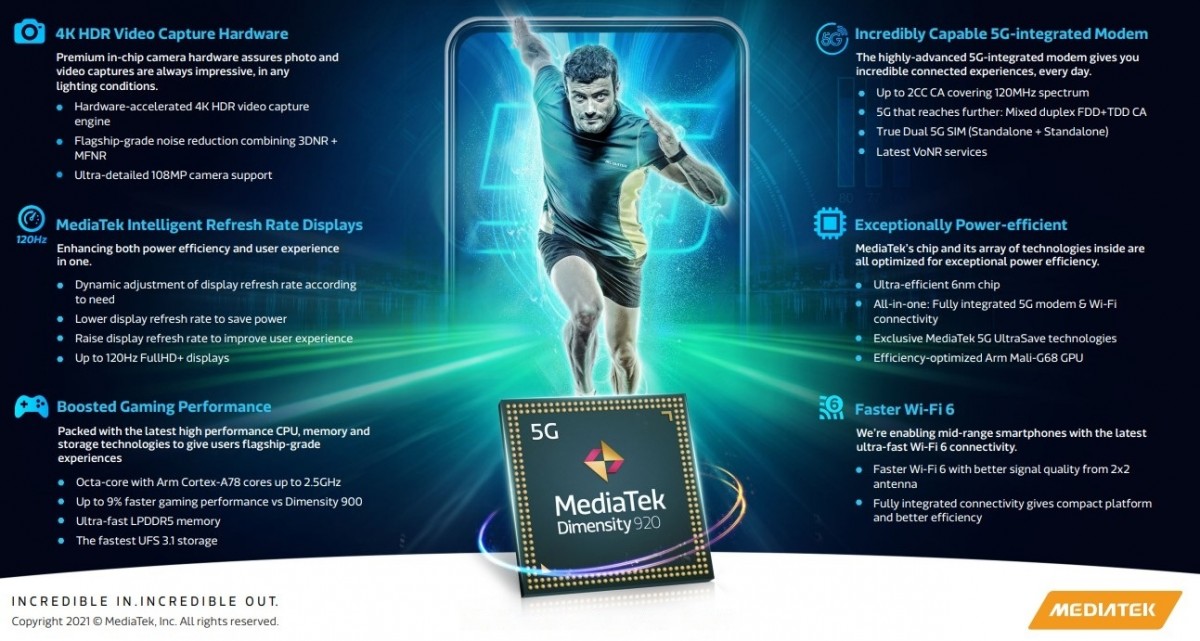 Dimensity 920 memiliki inti Cortex-A78 yang kuat berjalan pada 2.5GHz dengan yang Cortex-A55 clock pada 2GHz. GPU-nya adalah Mali-G68 MC4, dan diklaim desain yang dioptimalkan untuk efisiensi daya harus menawarkan kinerja game hingga 9 persen lebih cepat dibandingkan Dimensity 900.