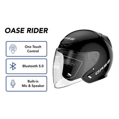 OASE Rider adalah helm berbentuk half face dilapisi warna hitam glossy dengan single clear visor, dan sistem penguncian micolock aman dan simpel, terdiri dari bahan ABS dengan kekuatan benturan ultra-tinggi dan ketahanan suhu rendah yang baik, busa EPS, dan smart system elektronik. Helm ini juga memiliki keunggulan anti-noise dan pengurangan kebisingan yang baik untuk memastikan tingkat kenyamanan dan perlindungan keamanan yang tinggi. Dilengkapi dengan built-in mic maupun speaker surround Bluetooth 5.0, dan juga memiliki fungsi radio serta menerima panggilan.