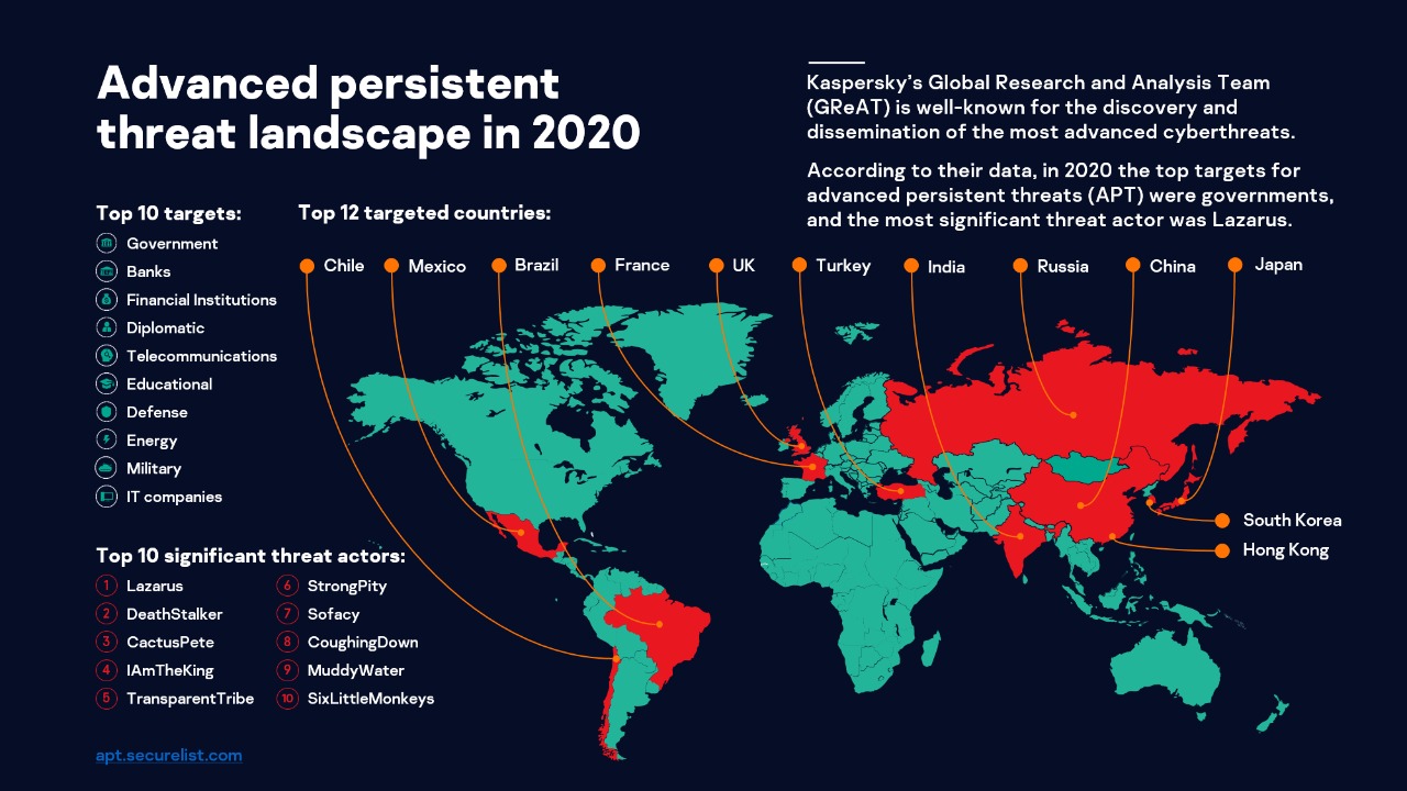 Pada tahun lalu, lebih dari 80.000 koneksi domain terkait COVID dan situs web berbahaya terdeteksi oleh Kaspersky di Asia Tenggara saja. Malaysia mencatatkan angka tertinggi diikuti oleh Vietnam, Filipina, dan Indonesia. Tren ini diperkirakan akan berlanjut hingga 2021 karena wilayah tersebut terus berjuang melawan pandemi dan meluncurkan vaksin dalam fase yang berbeda. Kelompok kejahatan siber menargetkan bank, pertukaran mata uang kripto di Asia Tenggara. Perbankan tetap menjadi target menawan bagi pelaku kejahatan siber. Faktanya, data dari Kaspersky’s GReAT mengungkapkan bahwa bank dan lembaga keuangan merupakan sektor kedua dan ketiga yang paling ditargetkan tahun lalu, secara global.