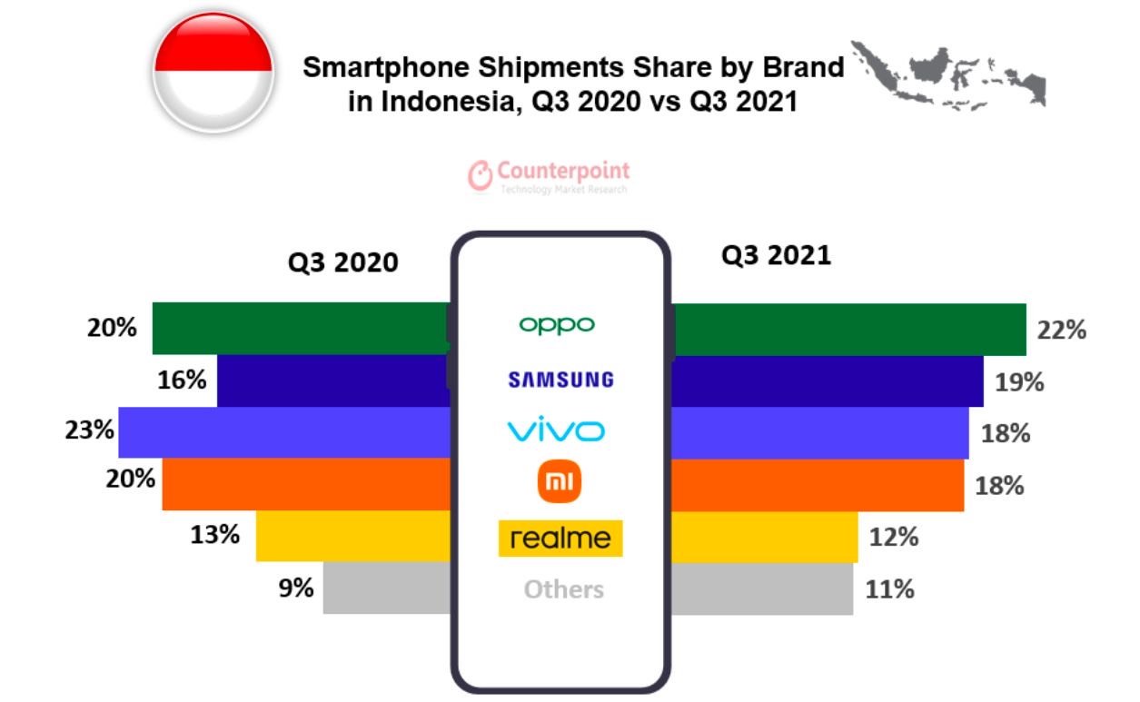 Pemulihan yang stabil dari masalah produksi terkait penguncian Covid-19 di Vietnam juga berperan. Perusahaan asal Korea Selatan itu disusul oleh vivo, Xiaomi, dan realme. Tempat ketiga dalam hal pengiriman smartphone selama Q3 2021 dipegang oleh vivo dengan pangsa 18 persen—turun dari posisi teratas selama periode yang sama tahun lalu.