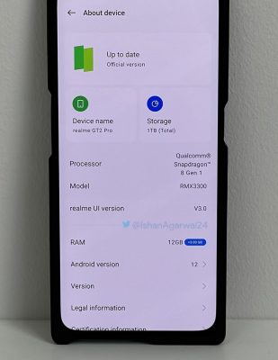 Disebutkan dalam live shot bahwa perangkat ini dilengkapi dengan Snapdragon 8 Gen 1, realme UI 3.0 berbasis Android 12, dan RAM virtual 3 GB. Yang menarik dari live shot ini adalah bahwa ia juga akan hadir dalam edisi penyimpanan 1 TB, varian ini akan menyertakan RAM 12 GB.