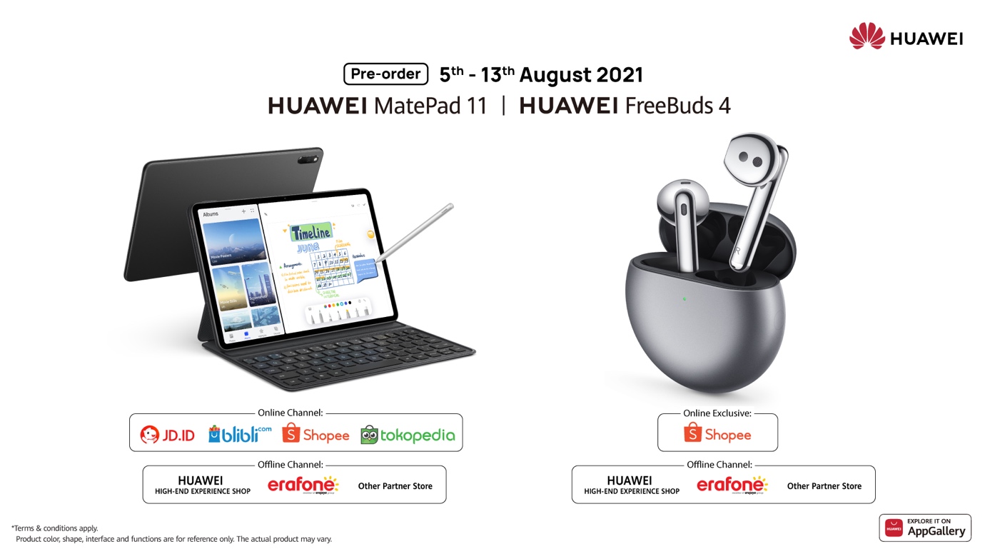 Sementara itu HUAWEI Freebuds 4 akan diluncurkan secara eksklusif secara online di Shopee dan saluran offline dapat dibeli melalui HUAWEI High End Experience Store, Erafone, dan toko mitra lainnya. Tidak hanya menghadirkan penawaran menarik untuk HUAWEI MatePad 11 dan HUAWEI FreeBuds 4, pada tanggal 5 hingga 10 Agustus Huawei akan bekerja sama dengan Shopee untuk mengadakan Huawei Super Festival di Shopee yang mana akan ada diskon hingga 50% dan didukung pengiriman gratis, eksklusif promo, COD, cicilan 0% untuk semua konsumen.