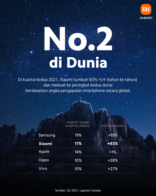 Pencapaian Xiaomi untuk pertama kalinya ini dicatatkan dalam laporan pasar smartphone global Q2 2021 oleh firma riset Canalys. Canalys melalui laporan ini menjelaskan bahwa Xiaomi kini mengalami transformasi model bisnis dari penantang (challenger) menjadi petahana (incumbent) melalui inisiatif seperti konsolidasi mitra di channel penjualan serta manajemen yang lebih rapi.