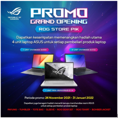 Pelanggan yang membeli laptop ASUS di ROG Store PIK akan mendapatkan berbagai merchandise ekslusif. Selain itu, setiap pelanggan yang melakukan transaksi pembelian (terkecuali aksesoris) di ROG Store PIK berhak mendapatkan kesempatan untuk memenangkan grand prize yang akan diundi pada bulan Februari 2022 mendatang.