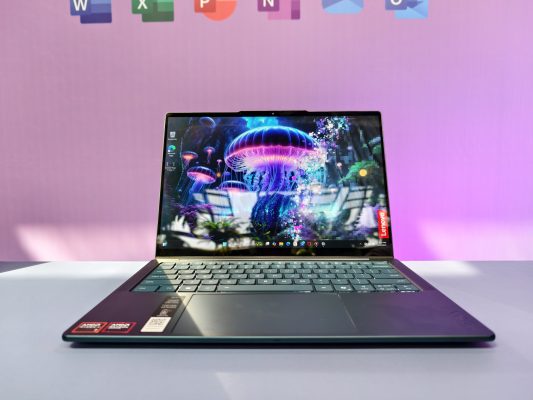 Layarnya menggunakan panel PureSight OLED 14 inci beresolusi 2.8K, menawarkan visual tajam, warna akurat, dan tingkat kecerahan tinggi, serta telah dilengkapi teknologi perlindungan mata. Dengan bobot hanya 1,28 kg, bodi aluminium yang tipis, baterai tahan hingga 22,5 jam, dan fitur pengisian cepat, Yoga Slim 7 sangat cocok untuk pengguna dengan mobilitas tinggi.