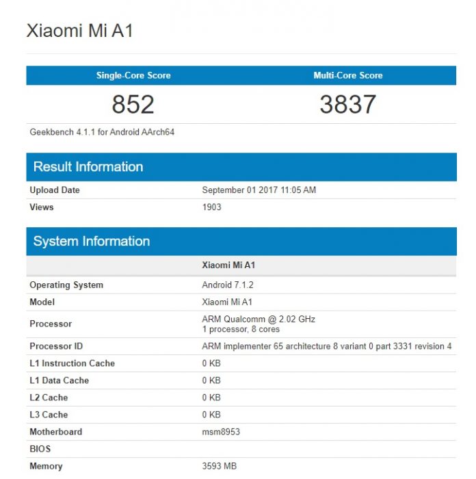 Dalam hasil pengujian tertera nama Mi A1. Dapur pacu Mi A1 ditenagai prosesor MSM 8953 yang tak lain adalah Snapdragon 625. Xiaomi turut menyematkan RAM 4 GB.