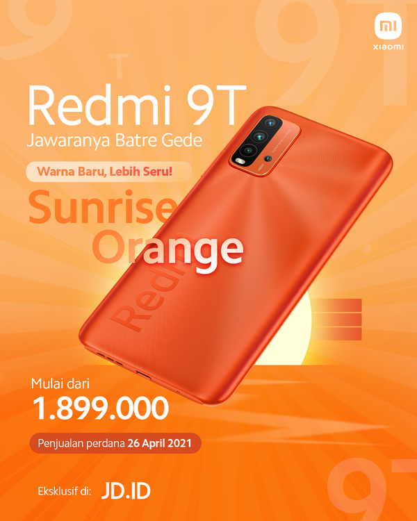 Xiaomi Indonesia memperkenalkan varian warna baru untuk Redmi 9T “Jawaranya Batre Gede” yakni Sunrise Orange dan sudah tersedia di channel online maupun offline. Warna baru Redmi 9T ini adalah pilihan yang tepat bagi pengguna yang ingin mengekspresikan jiwa muda yang penuh semangat dan keceriaan.