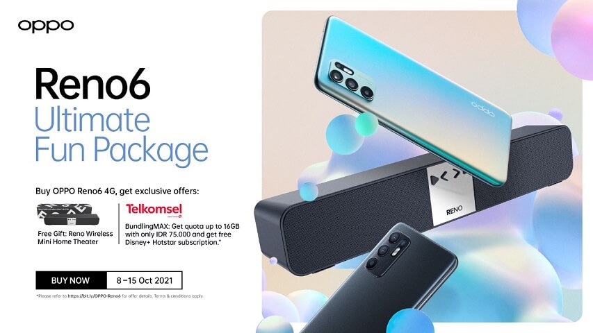 Buat yang mau membeli Hp OPPO Reno6, sekarang lagi ada promo ‘Reno6 Ultimate Fun Package’. Di mana setiap pembelian Hp ini juga akan mendapatkan secara gratis produk wireless speaker Reno Wireless Mini Home Theather. Selain itu juga akan mendapatkan kartu Telkomsel plus gratis berlangganan Disney Hotstar. Program Reno6 Ultimate Fun Package berlangsung pada 8 hingga 15 Oktober 2021.