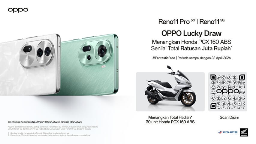 Konsumen yang telah membeli Hp OPPO Reno 11 Pro 5G dan Reno11 5G mulai dari 11 Januari hingga 22 April 2024 secara offline maupun online, dapat mengikuti program OPPO Lucky Draw untuk memenangkan 30 unit motor Honda PCX 160 ABS senilai ratusan juta rupiah.