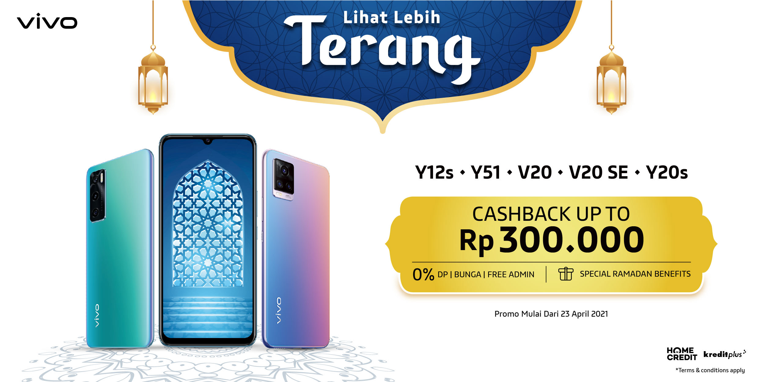 Merayakan bulan Ramadan tahun ini, vivo Indonesia menggelar program “Lihat Lebih Terang” untuk menyempurnakan momen kebersamaan yang penuh berkah dengan keluarga. Melalui program ini, vivo memberikan potongan harga spesial dan cashback hingga Rp 300.000,- untuk produk-produk pilihan vivo, yaitu vivo V20, vivo V20 SE, vivo Y51, vivo Y20s, dan vivo Y12s. Program ini sudah dapat dinikmati sejak tanggal 23 April 2021 melalui kanal offline dan online resmi milik vivo maupun melalui mitra e-commerce resmi vivo.