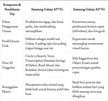 Baik Galaxy A57 5G, maupun A37 5G digadang Samsung menghadirkan berbagai peningkatan guna memberikan pengalaman yang lebih lancar, praktis, dan relevan dengan kehidupan digital masa kini.