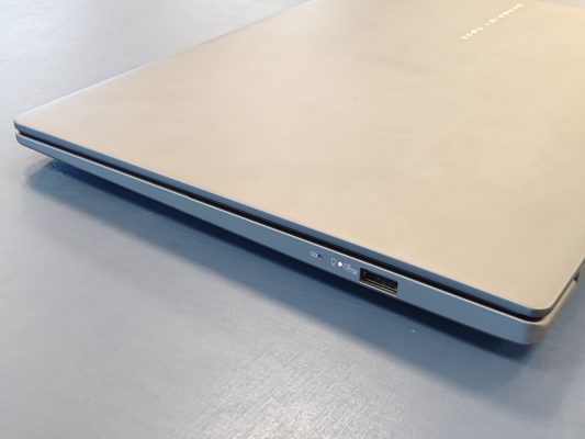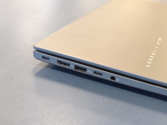 Selain itu, laptop ini juga menawarkan solusi konektivitas yang sangat lengkap untuk menunjang produktivitas modern tanpa memerlukan banyak dongle tambahan. Pada sisi kiri bodi, terdapat deretan port utama yang mencakup satu port HDMI 2.1 TMDS, satu port USB 3.2 Gen 1 Type-C yang mendukung Power Delivery, audio jack 3.5mm, serta pembaca kartu MicroSD.