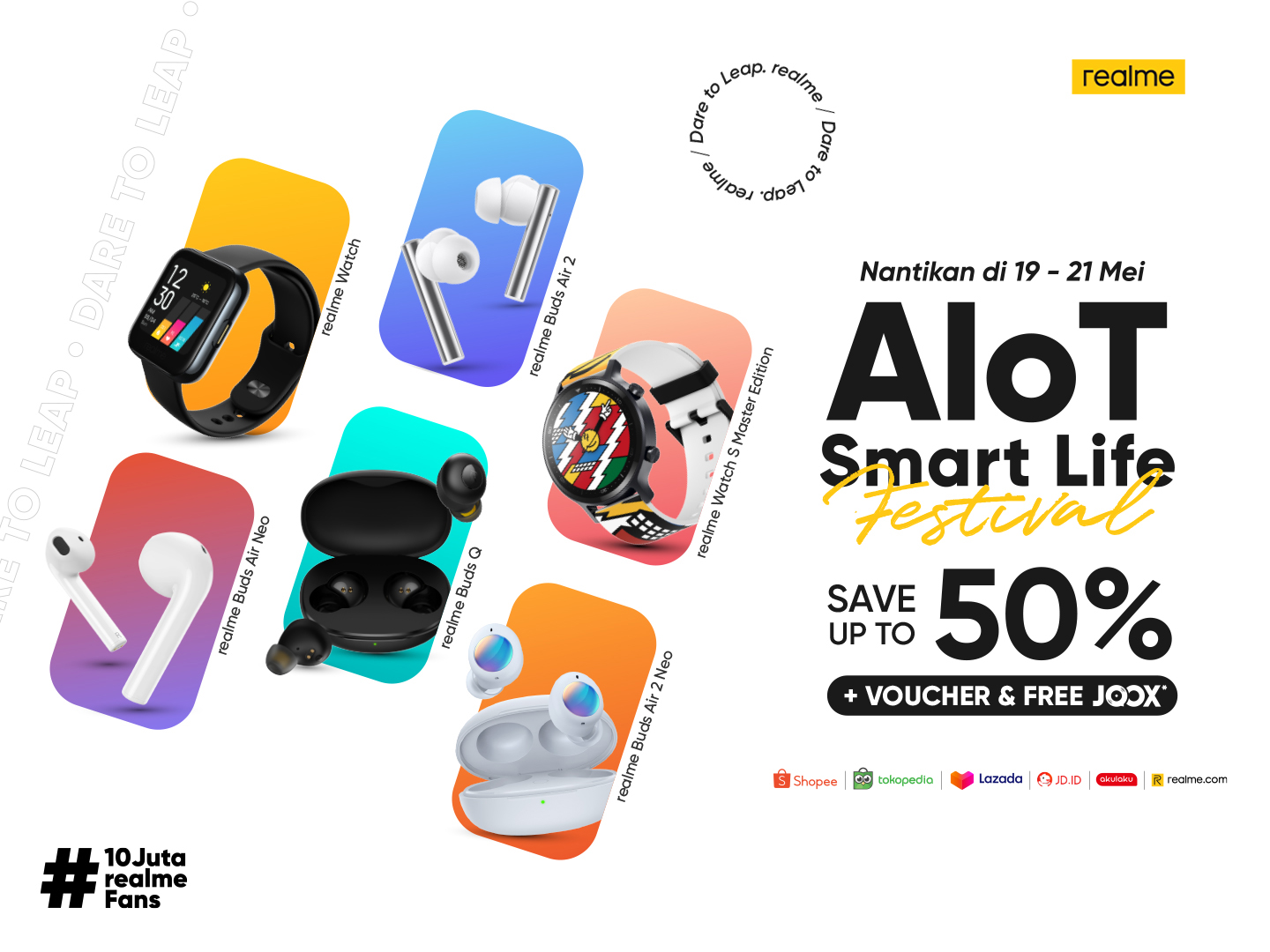 Diselenggarakan pada 19 – 21 Mei di Shopee, Tokopedia, Lazada, Akulaku, JD.ID dan realme.com/id, kamu bisa berburu berbagai AIoT keren dengan diskon khusus.
