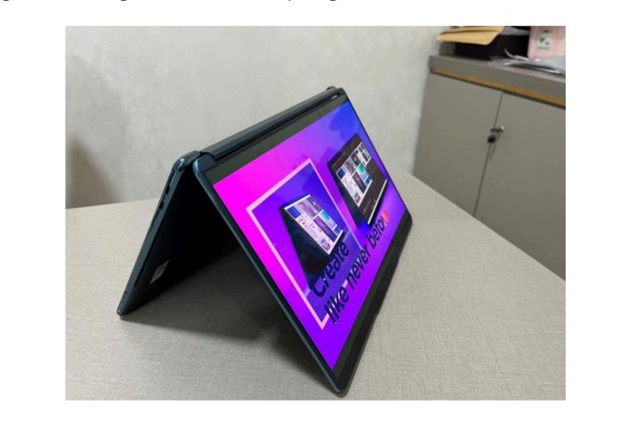 kemampuan beralih antara berbagai mode seperti mode notebook, tablet dengan keyboard touchscreen, tenda (tent), dan mode portrait, Lenovo Yoga Book 9i memberikan aneka opsi yang bisa disesuaikan dengan kebutuhan pengguna.