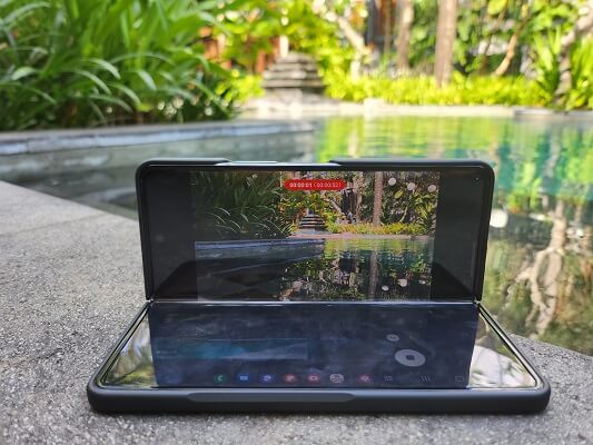 2. Begitu ide cerita dari vlog sudah tertuang, saatnya eksekusi. Dalam hal ini, Galaxy Z Fold4 5G seperti punya built-in tripod–cukup tekuk perangkat dan posisikan di angle terbaik lalu ambil foto atau video secara hands-free. Dengan cara ini, kamu bisa ambil berbagai footage dengan mudah seperti foto di tepi kolam, photogroup bareng teman, hingga timelapse yang bisa diatur tingkat percepatannya.