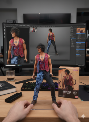 “Ubah gambar agar terlihat seperti cetakan 3D gaya Anime dengan kulit realistis seperti silikon cerah, berpose seperti foto di dasar akrilik. Di sebelahnya, letakkan kotak berwarna dan ilustrasi karakter yang mirip dengan foto referensi, dengan teks “BANDAI'” dan logo “BANDAl action figure” Di belakangnya, tambahkan layar PC melengkung yang menampilkan ZBrush atau render karakter, dan juga sertakan foto di layar, sebagai bagian dari latar belakang cetak 3D di ruang game. Di atas meja coklat, letakan buku hitam, segelas kopi, keyboard, mouse, dan vape. Dari kamera depan, tangan pria terlihat menyesuaikan / memperbaiki gambar. Wajah dan penampilan harus sesuai dengan foto referensi di atas. (sesuaikan gambar sesuai ). UItra detail, tekstur tajam, hiper realistis. ditampilkan dalam resolusi 4K.“